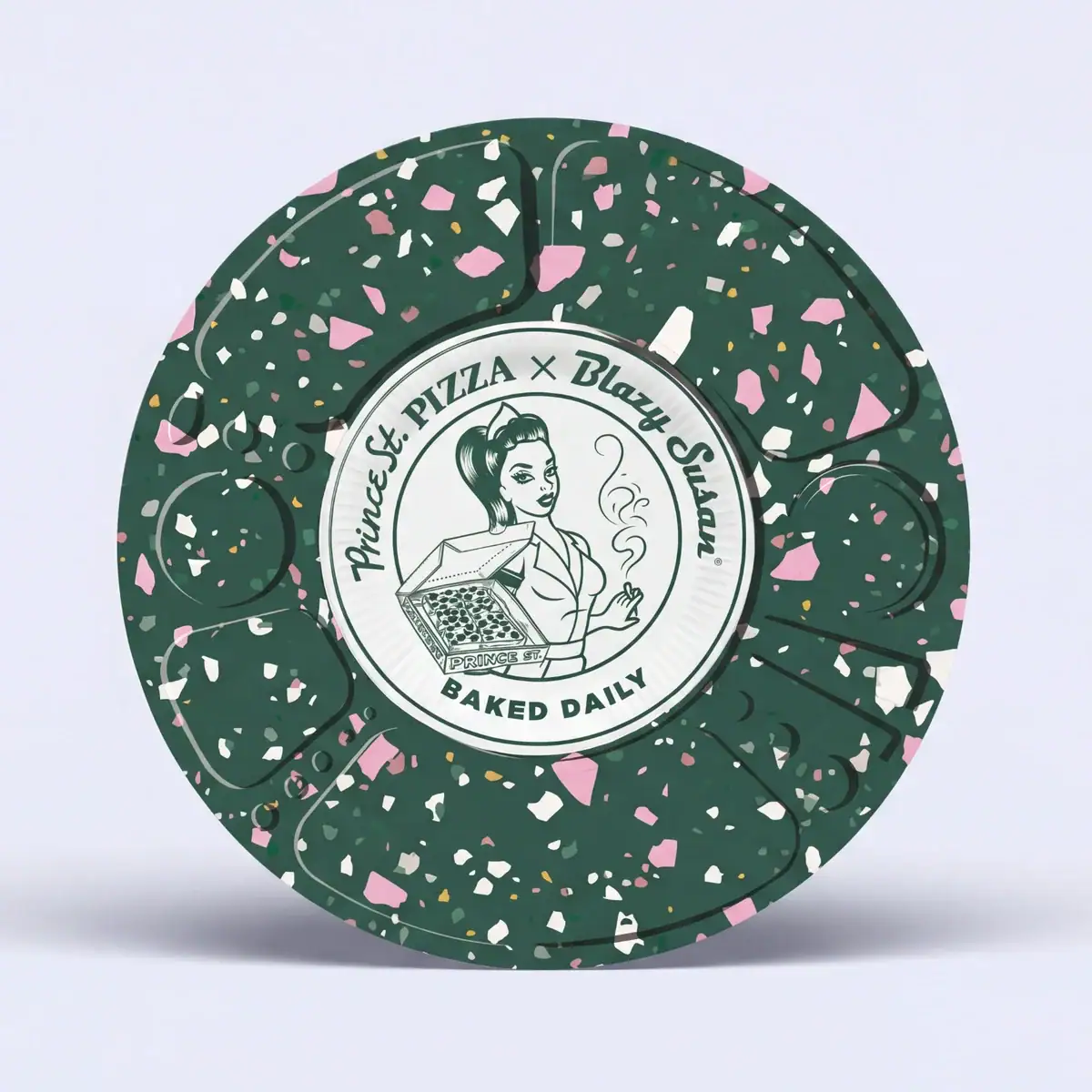 Fresh from the oven and ready to roll. The Baked Daily edition spinning tray brings this legendary Prince St. Pizza collab to your living room.