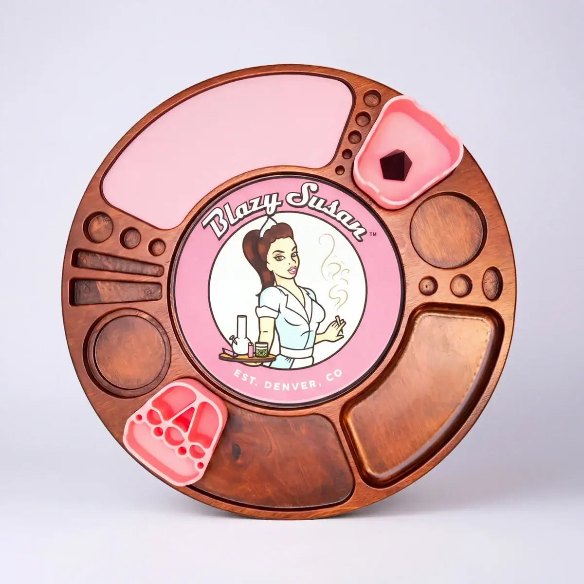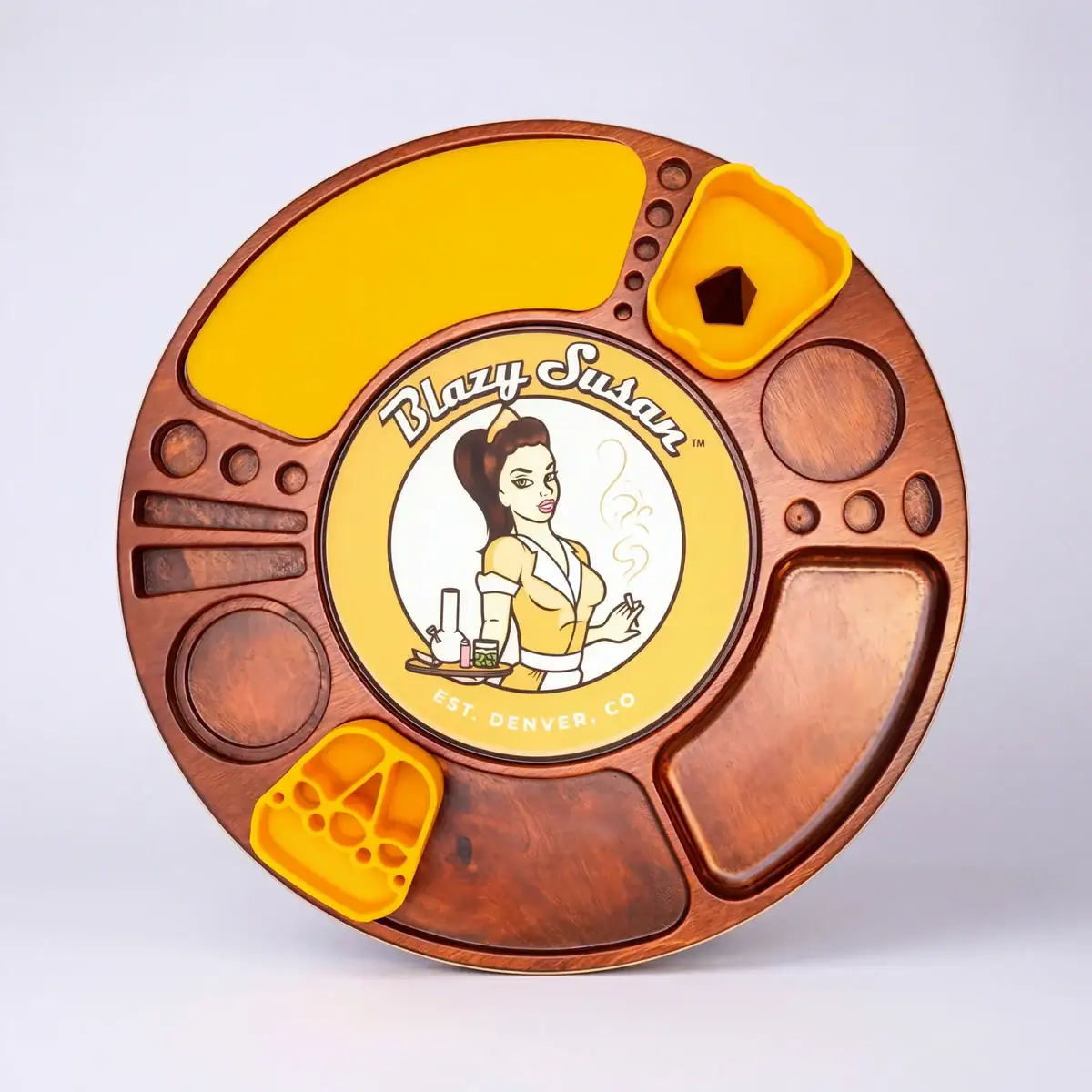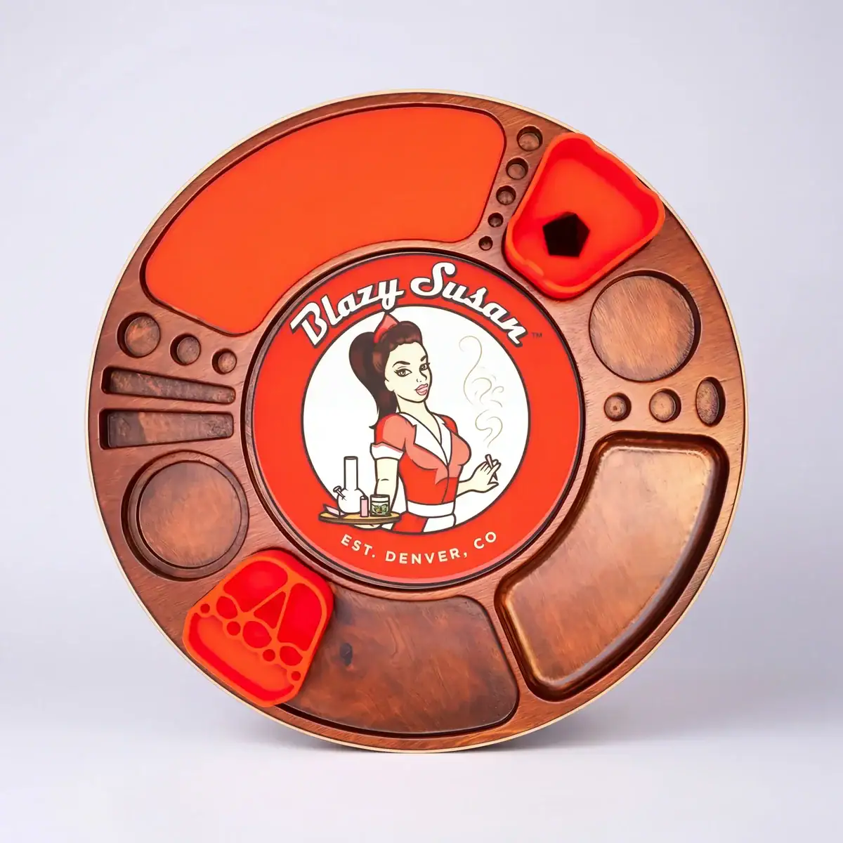 Hand-machined & sanded at our production facility in Denver, CO, the Blazy Builds team treats every tray with love & care. Each Blazy Susan is unique in its markings and patterns, clear-coated for longevity and easy rolling.