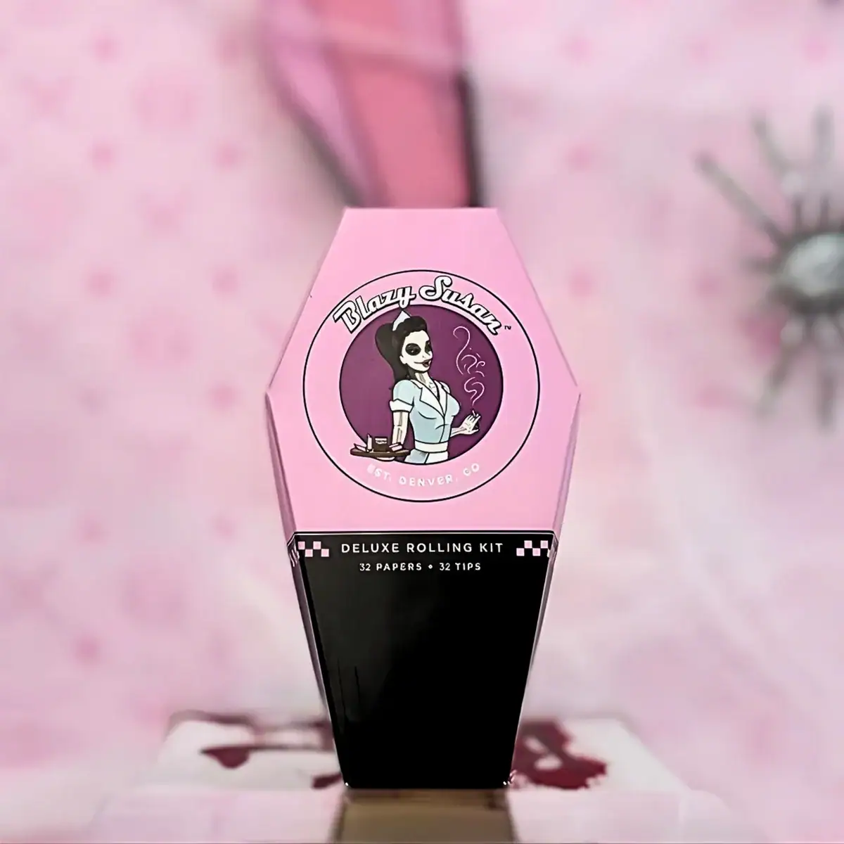 A collector’s piece that’s both practical and playful, the Blazy Susan Coffin Kit includes our signature pink King Size papers and matching tips.