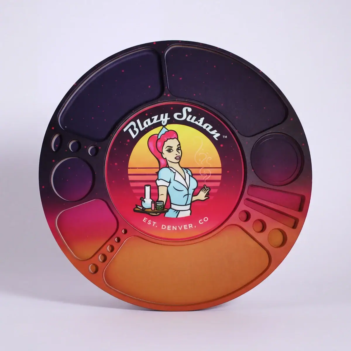 The Blazy Susan Spinning Rolling Tray features an innovative design with small compartments for all different types of smoking accessories and supplies including lighters, pre rolls, bangers, your cell phone, and more. This tray was built from the ground up through consumer feedback and has more functionality than any other rolling tray on the market. The Blazy Susan Spinning Rolling Tray is truly revolutionary, and was built by smokers for smokers. Give it a spin – your coffee table will never be the same!