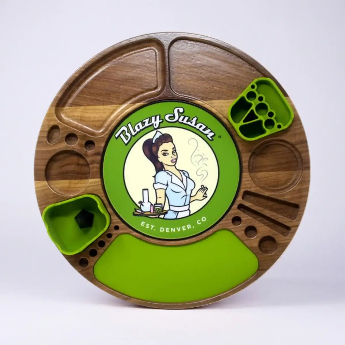 The Walnut Blazy Susan Spinning Rolling Tray features an innovative design with small compartments for all different types of smoking accessories and supplies including lighters, pre rolls, bangers, your cell phone, and more. This tray was built from the ground up through consumer feedback and has more functionality than any other rolling tray on the market. The Blazy Susan Spinning Rolling Tray is truly revolutionary, and was built by smokers for smokers. Give it a spin – your coffee table will never be the same!