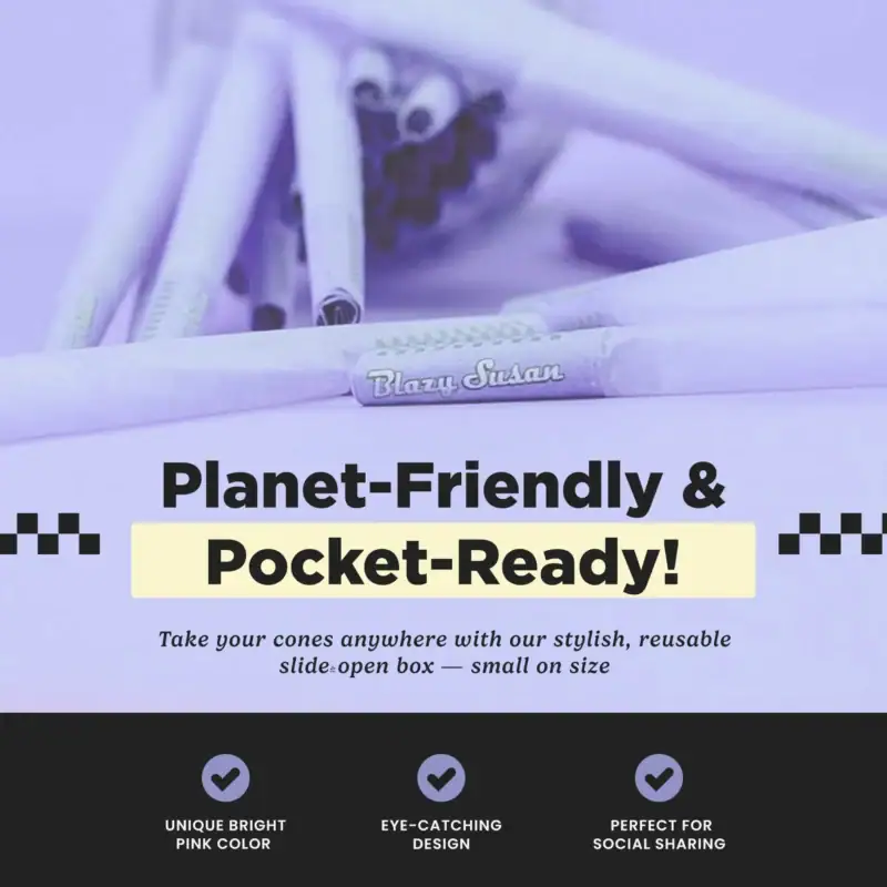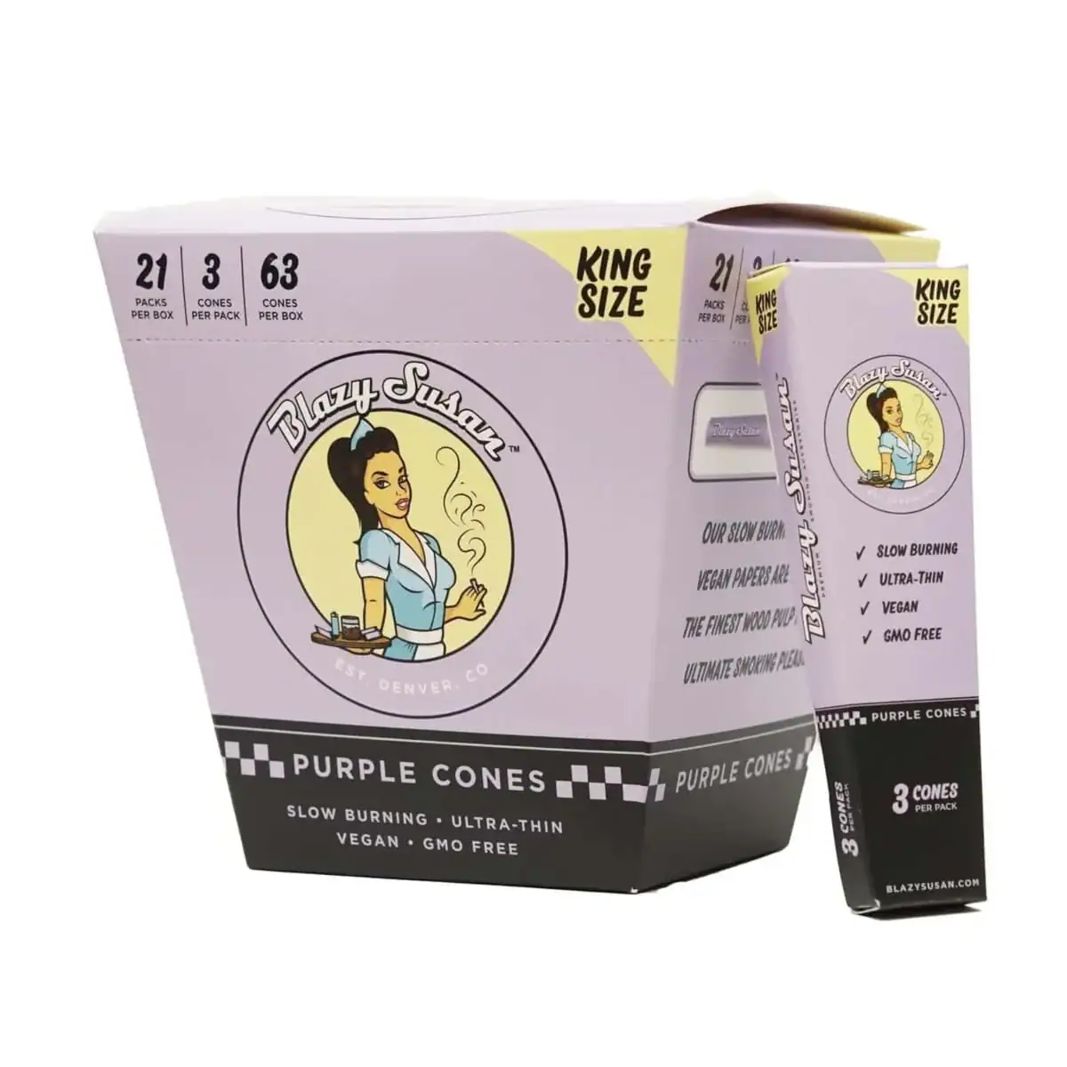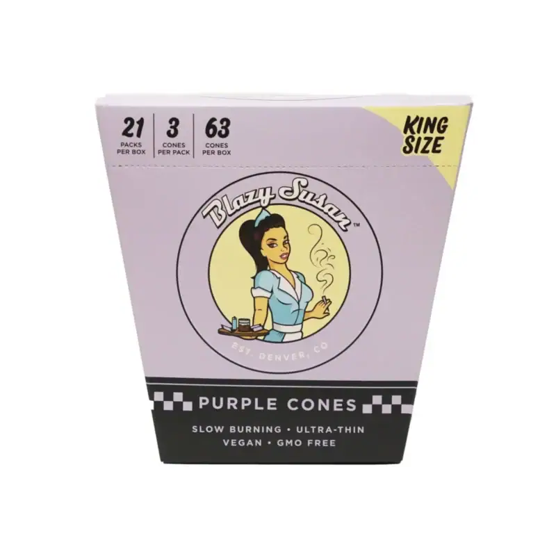 King Size Purple Pre Rolled Cones – Full Box | You’ve been asking for them, and now they’re here! Say hello to the latest addition to the Blazy suite, Kings and Queens. Our box comes with 63 pre-rolled King Sized cones to keep your session burning slowly and smoothly. Made with our world famous vegan and non-GMO paper made in France, these convenient cones are a must-add to any rolling kit.