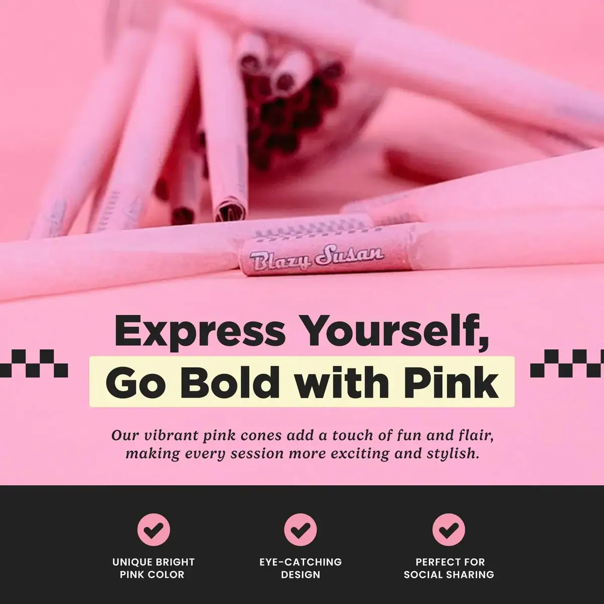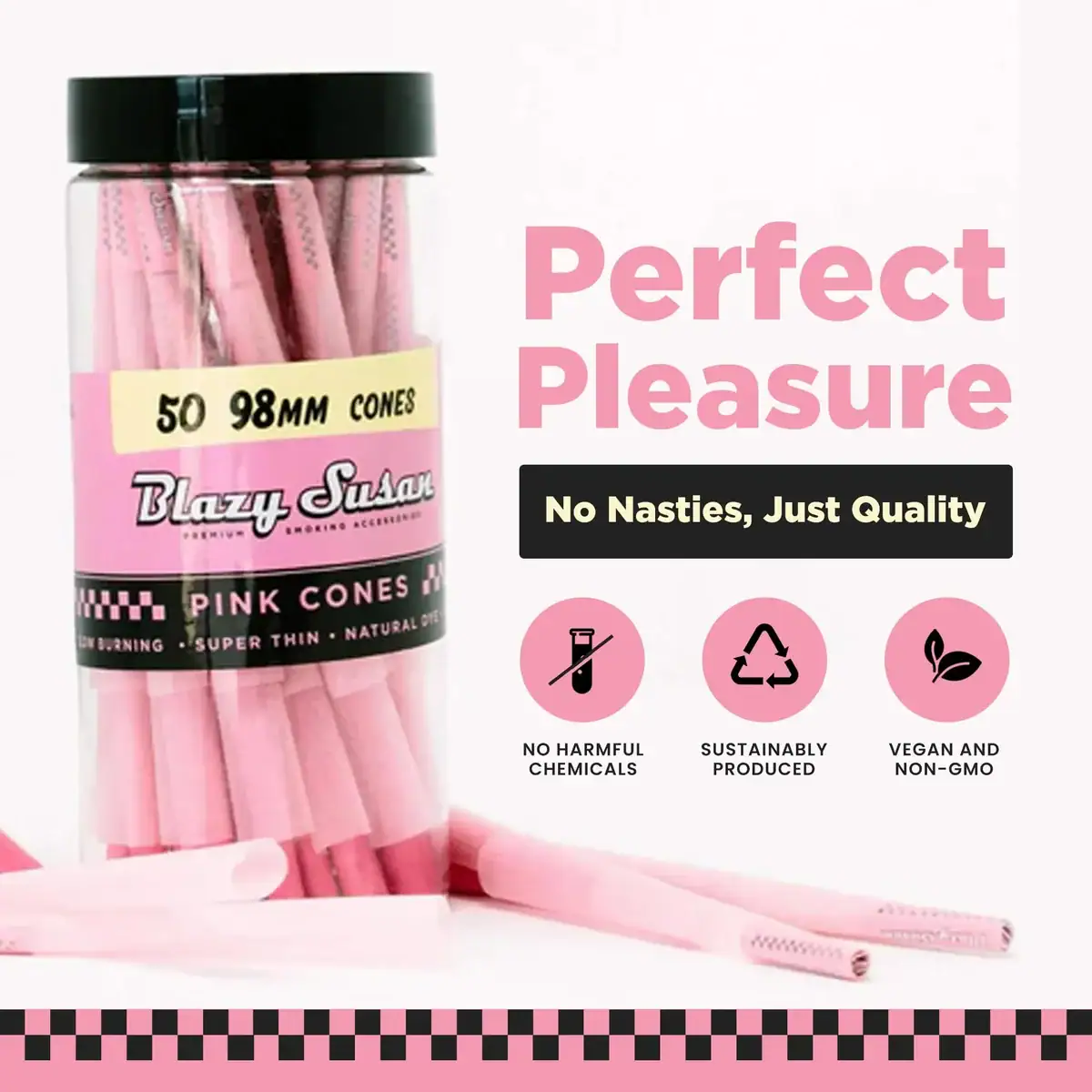 Roll in style with the iconic Pink Pre Rolled 98mm Cones – available in this convenient 50-count jar. These ultra-chic cones are made with our world-famous Blazy Susan Pink rolling paper, crafted from premium, non-GMO Fine French paper for a smooth, slow burn every time.