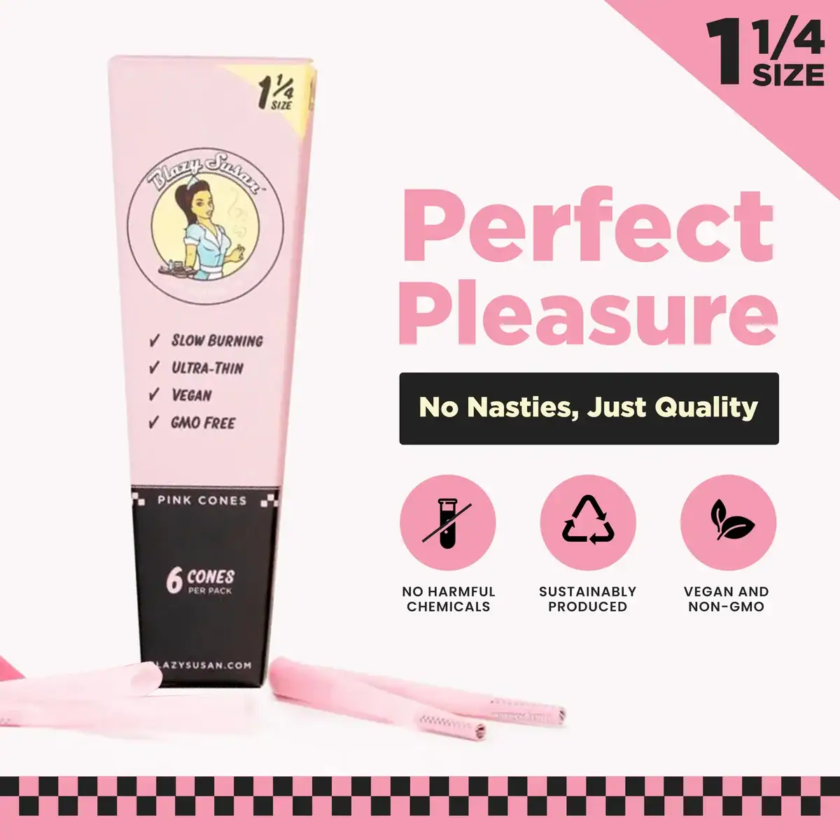 Our 6 Pack of Pink Pre Rolled Cones is one of the most popular Blazy Susan products for a reason; these cones are the perfect option for anyone looking for a convenient and easy way to add pink to your sesh. This pack comes with 2 stacks of 3 pink cones, as well as eco-friendly pink straws to make packing them even easier.